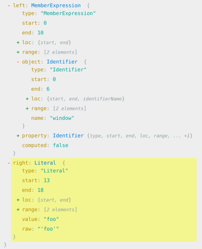 As you can see, each node in the tree represents a part of the code, and it’s recursive. The assignment expression foo = "foo" uses the operator =, the operand on the left is an identifier named foo and the operand on the right is a literal with the value "foo". So that’s how it goes, each part of the code can be presented as a node which is made out of other nodes, each node has a type and additional properties based on its type.